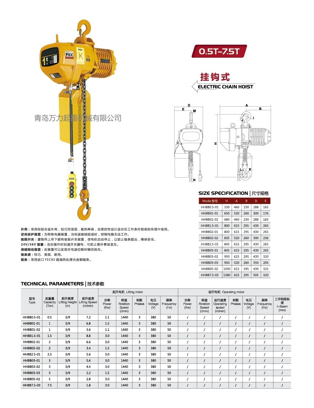 極限開關(guān):吊上吊下都有開關(guān)裝置,使自動(dòng)停止,防止鏈條超出,確保安全。