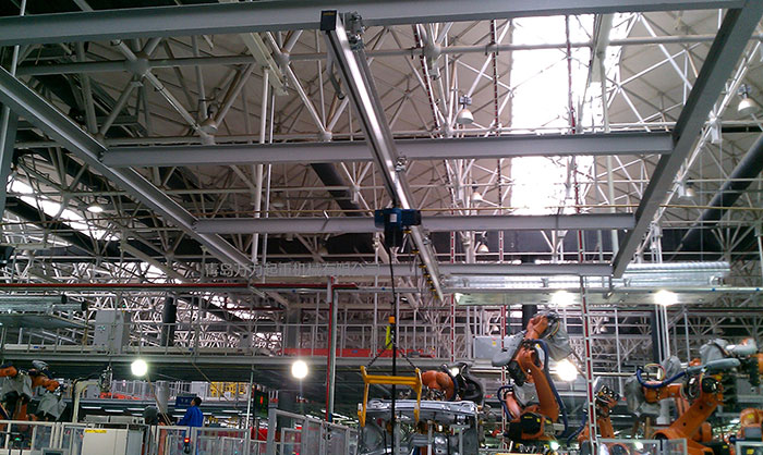鋁合金軌道組合式起重機(jī)械系統(tǒng)需要客戶的廠房屋頂結(jié)構(gòu)可承受足夠強(qiáng)度、安全支撐起重機(jī)負(fù)載;