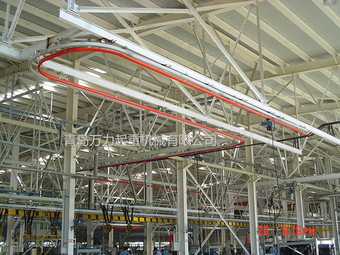 KBK起重機(jī)中的KBK是KombiniertKran的縮寫,意為組合式起重機(jī),主要由軌道、懸掛裝置、行走小車和一些功能組件構(gòu)成,所有模塊都為標(biāo)準(zhǔn)組件。起升裝置主要采用環(huán)鏈電動(dòng)葫蘆,也可吊掛一些機(jī)械手或焊槍之類,作為工具滑軌使用。起重量一般為125kg-2000kg。